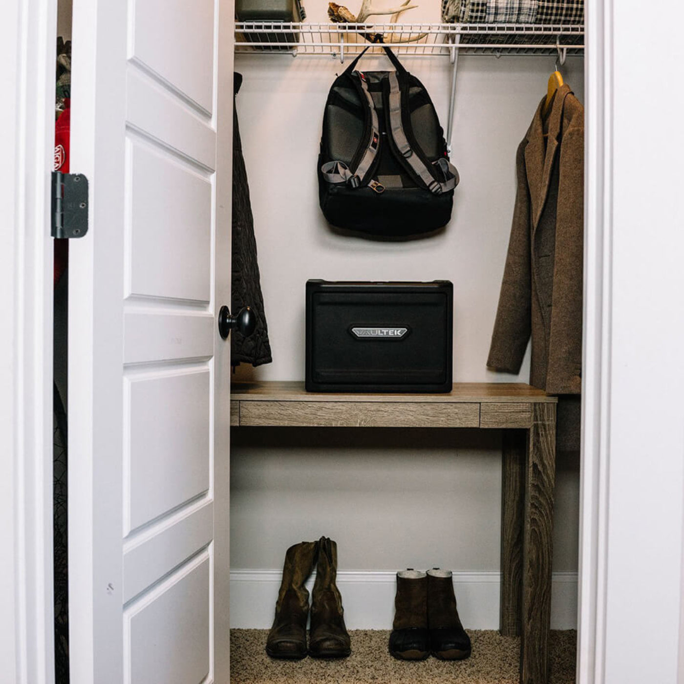 The NMXi is the largest size handgun safe Vaultek makes and is the ideal nightstand or closet safe. With the auto-open door and several methods of entry, you'll be able to get into your safe when you need it most. It still uses the lithium-ion battery if you deem it able to be portable but that's exactly why they developed multiple sizes, one for the home and one for travel. What makes this safe especially cool is it's ability to be customized. It's fully adjustable and you can add or remove pistol racks, clip storage and the shelf as desired.