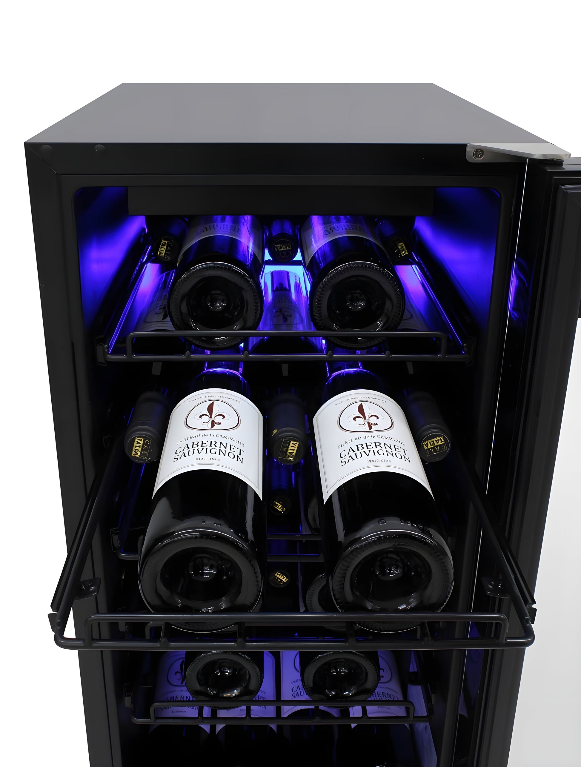 Store your wine collection in this elegant Vinotemp 32-Bottle Single-Zone Wine Cooler. Featuring seamless, all-glass technology, this all-black wine refrigerator has room to store up to 32 bottles on six telescopic shelves and 1 bulk storage section. A digital temperature touchscreen controller located at the top of the cooler allows you to see and set the temperature without having to open the cooler door. Its patented interior Backlit panel lighting has three different color options - Heliotrope, Amber, and Vinotemp BioBlu (which helps reduce the growth of bacteria and mold) - and can be selected at any given time. This wine refrigerator is front venting with easy installation to build in and fit perfectly in any kitchen or bar area. Sturdy, stylish patented label forward VinBo Racks in black cradle bottles so the labels of wine stored are front facing while the racks glide and extend forward, adding to the cooler's visual appeal and ease of use. A full glass door with black edge and door lock add to the style and functionality of this cooler. This wine cooler will make your small to medium sized wine collection stand out.
