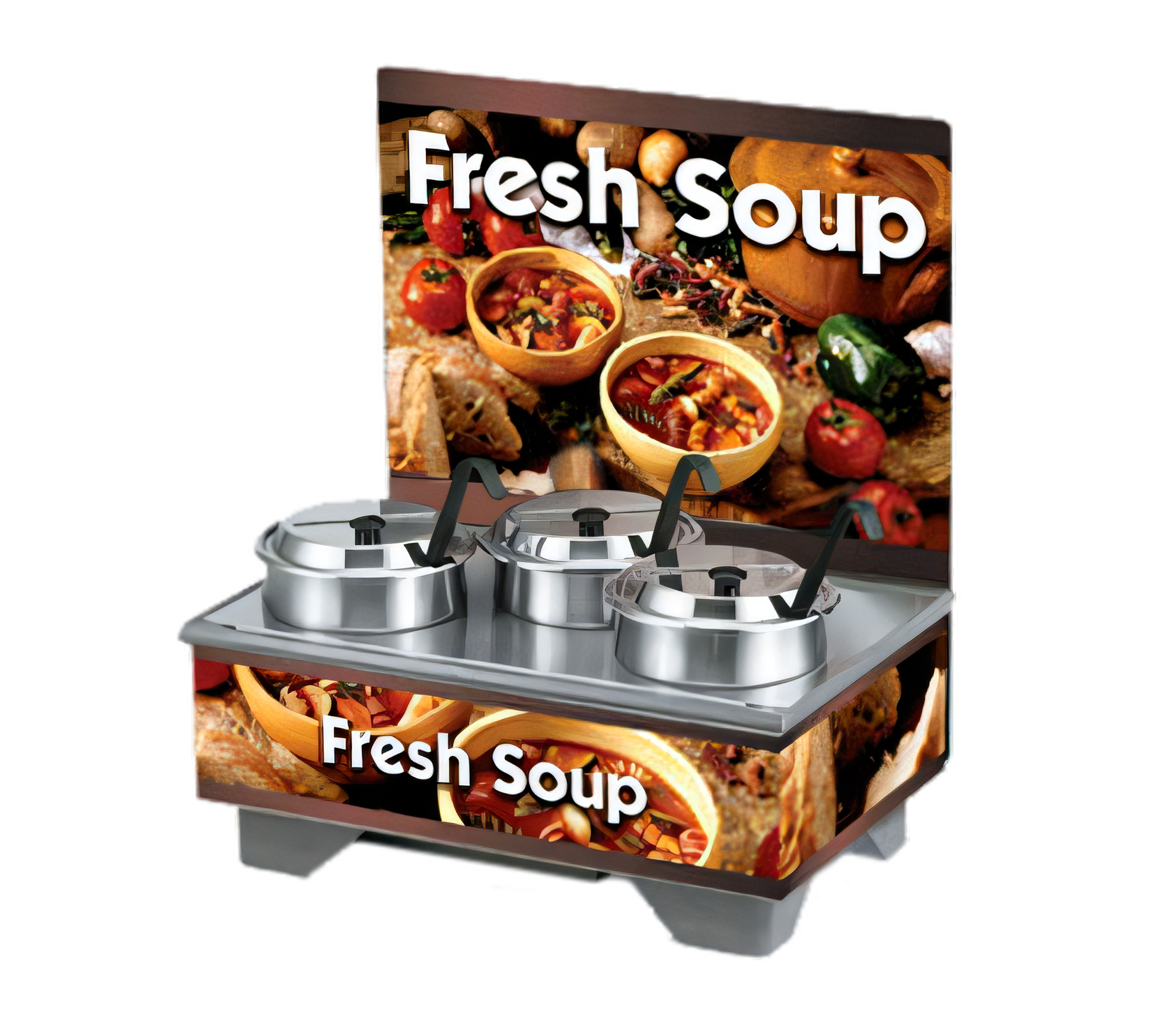 Cayenne 72020 Full Size Rethermalizing Model 1220 Soup Merchandiser Base, flush mount menu board, Country Kitchen graphics, & 4 quart accessory pack: (1) 72228 4 quart, adapter plate, (3) 4 quart insets, (3) 47486 hinged covers, (3) 4980320 3 oz., Kool-Touch® stainless ladles, 18-1/2"Wx 26-1/4"D x 13-3/4"H, 120v/60/1-ph, 1000 watts, 8.3 amps, NEMA 5-15P, UL, NSF, Made in USA (Refer to vollrathfoodservice.com for full warranty policy)