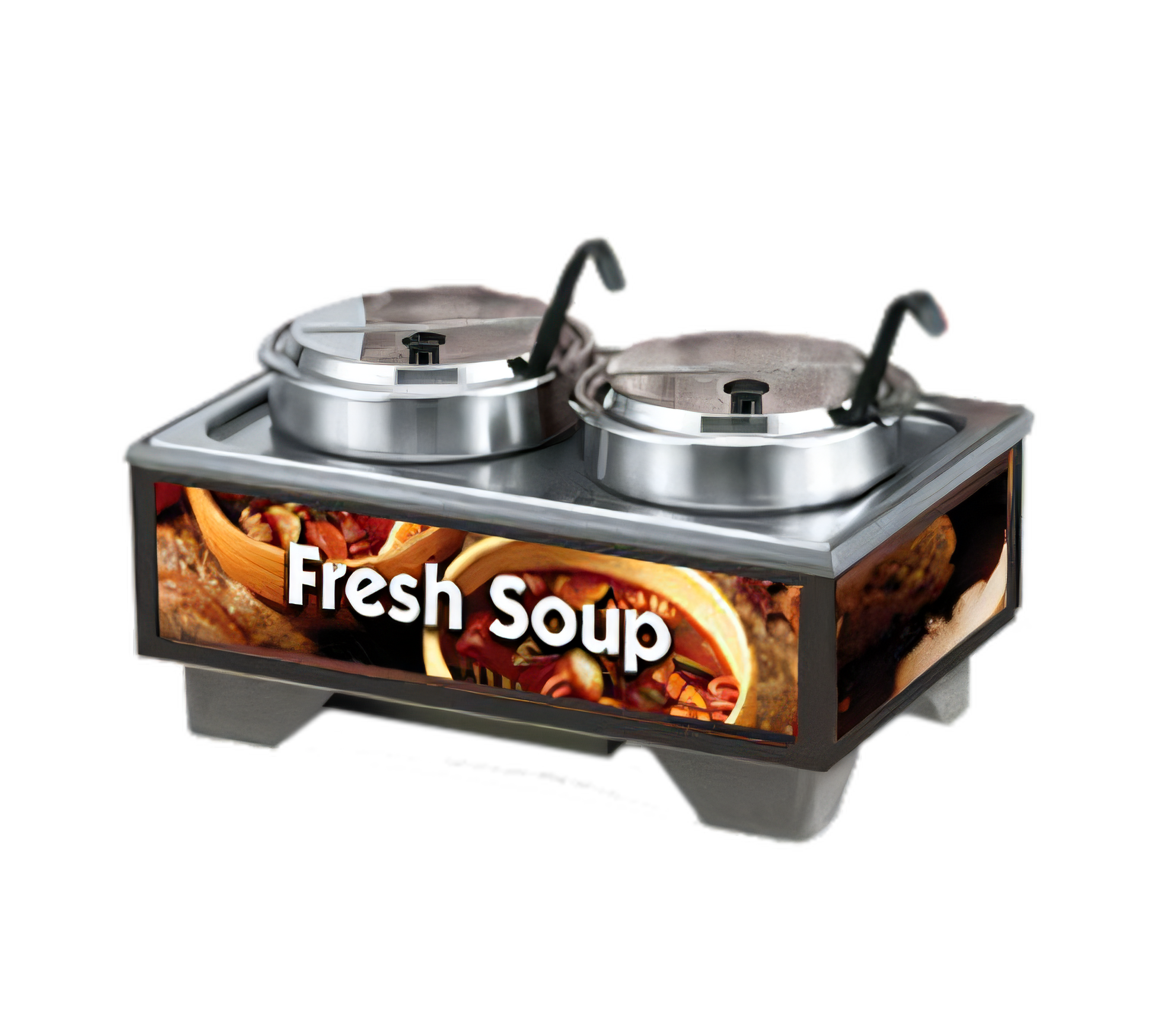 Cayenne 72020 Full Size Rethermalizing Model 1220 Soup Merchandiser Base, Country Kitchen graphics, & 7 quart accessory pack: (1) 19192 7 quart, adapter plate, (2) 78184 7 quart, insets, (2) 47488 hinged covers, (2) 4980320 3 oz., Kool-Touch® stainless ladles, 18-1/2"W x 26-1/4"D x 13-3/4"H, 120v/60/1-ph, 1000 watts, 8.3 amps, NEMA 5-15P, UL, NSF, Made in USA (Refer to vollrathfoodservice.com for full warranty policy)