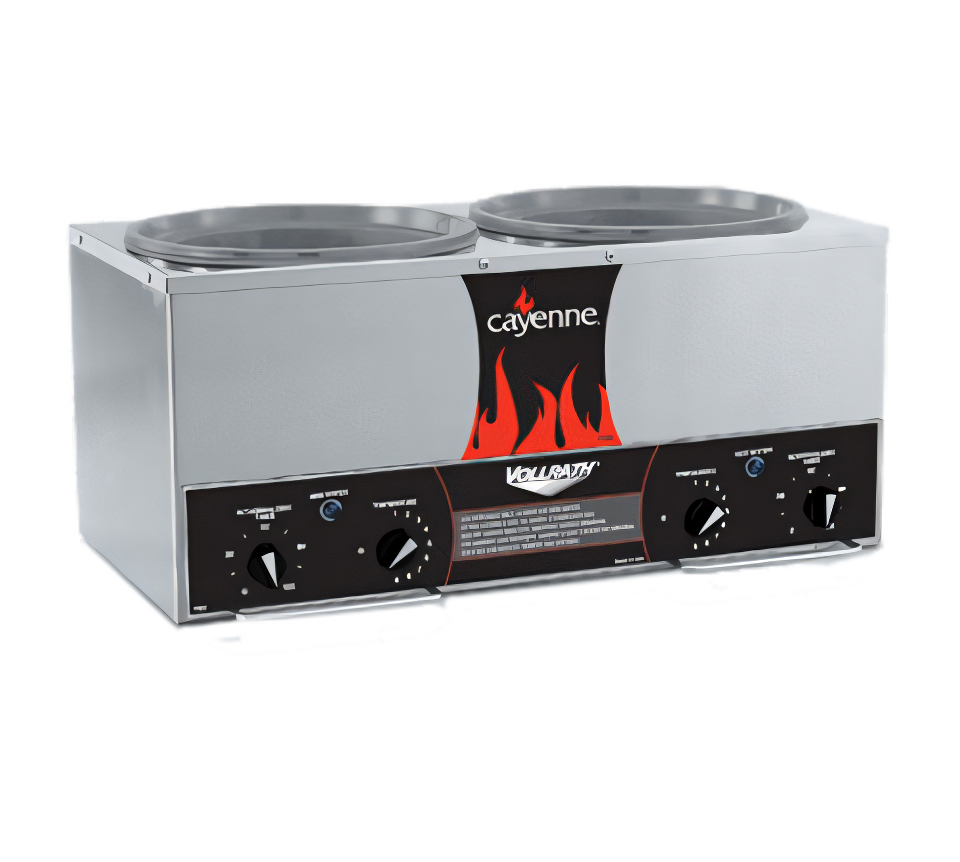 Cayenne Twin 7 quart,Well Countertop Cooker/Warmer with Accessory Kit, designed to Retherm & hold cooked product, stainless exterior, thermostat wells, accommodates (2) 7 quart, insets, (2) 700W elements, 120V, 11.7A, accessory kit includes (2) 78184 Insets 7-1/4 quart (2) 47488 Hinged Kool-Touch® covers, (2) 4980420 heavy-duty 4 oz. ladles, NEMA 5-15P, NSF, UL CUL, Made in USA (Refer to vollrathfoodservice.com for full warranty policy)