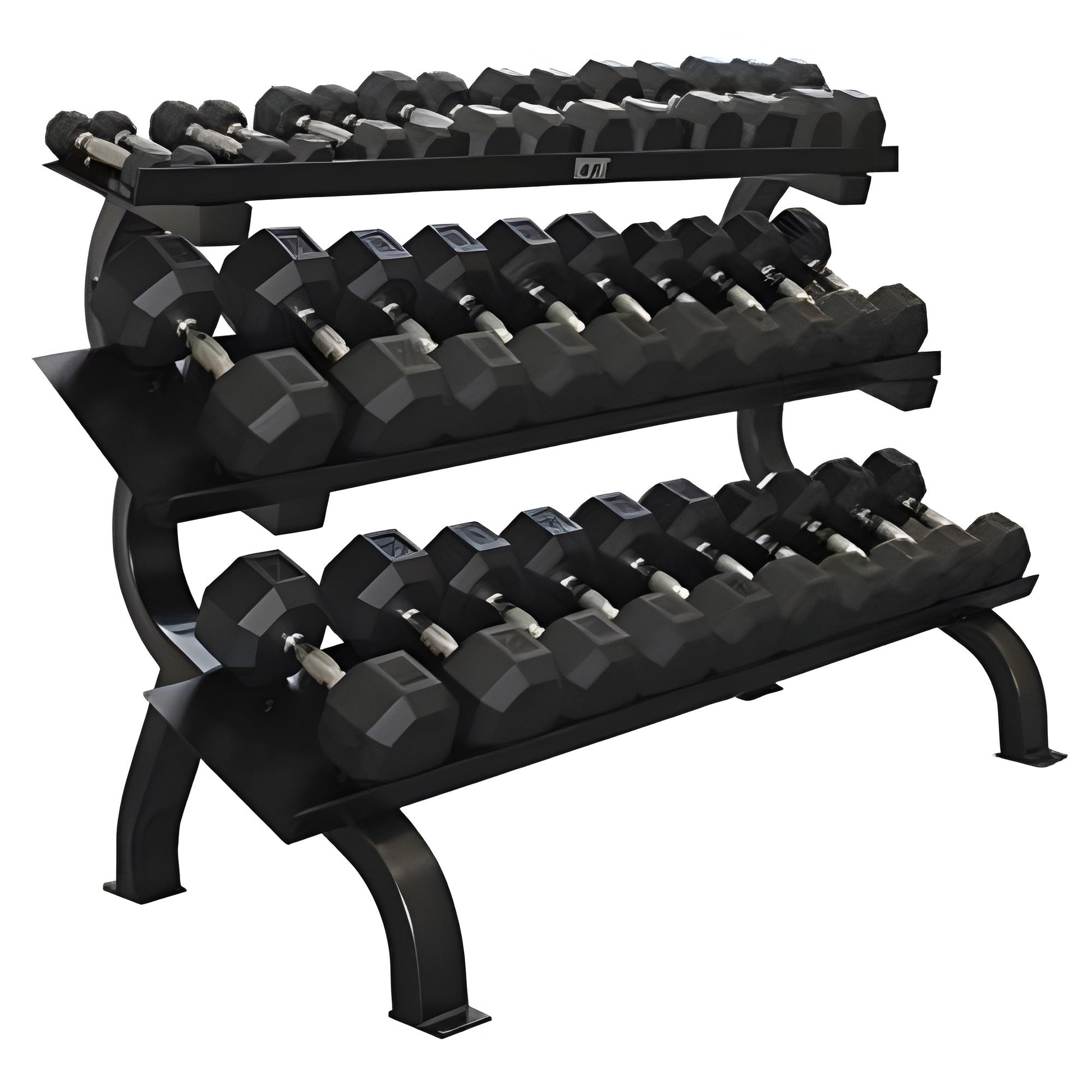 A: A heavy-duty, 3-tier storage rack designed to hold a full set of dumbbells while keeping your gym space organized.