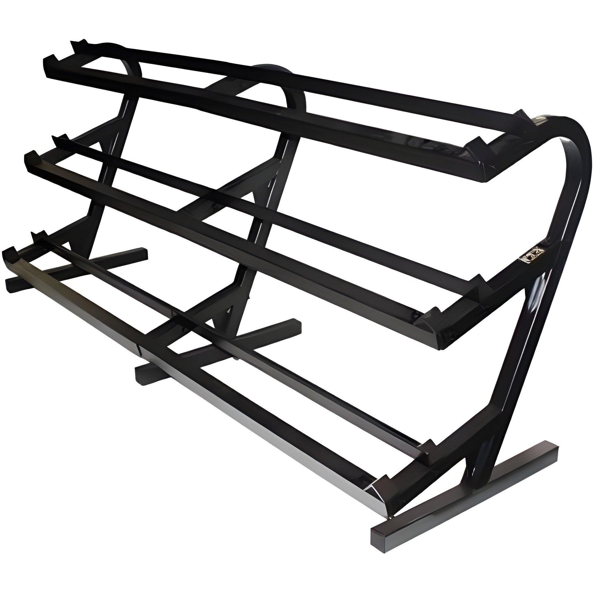 A: A durable 3-tier horizontal rack designed to store multiple pairs of dumbbells efficiently.