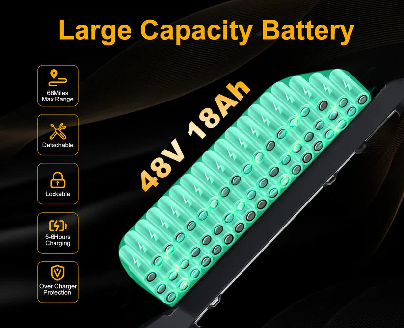 🔊Powerful Brushless 1500W Peak Motor&48V18Ah:The Vynxet electric bike with a 750W Brushless motor (peak 1500W),a large capacity 48V18Ah battery,it delivers strength, stability, and speed up to 32MPH.So you can reach your destinations swiftly, regardless of conditions.the long-distance for Vynxet ebike commutes or travel are no longer a challenge!