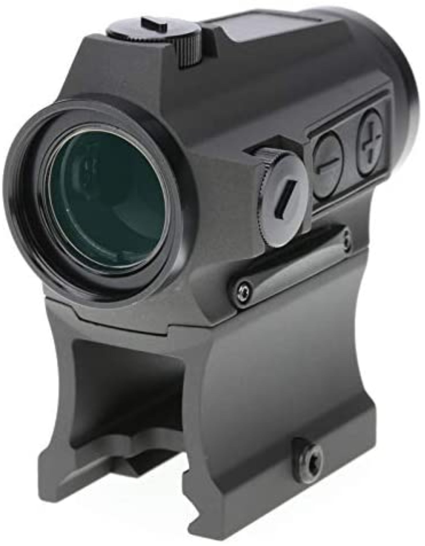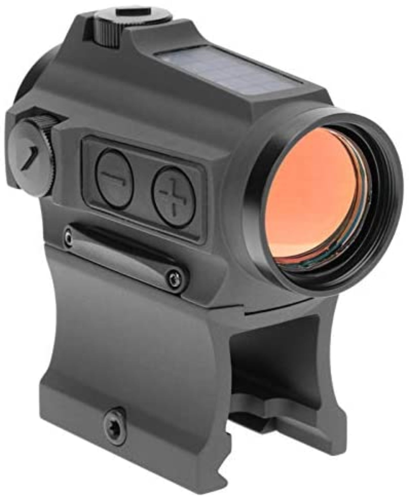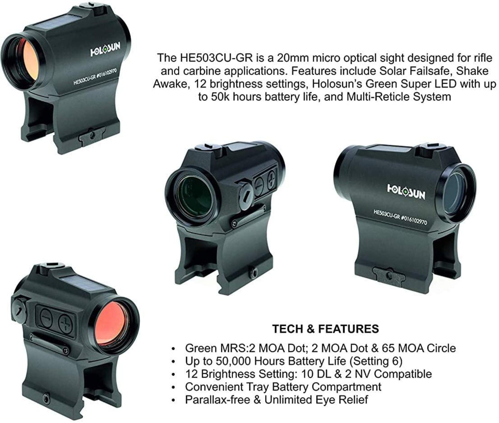 is a 20mm micro optical sight designed for rifle and carbine applications. Features include Solar Failsafe, Shake Awake, 12 brightness settings, Holosun’s Green Super LED with up to 50k hours battery life, and Multi-Reticle System