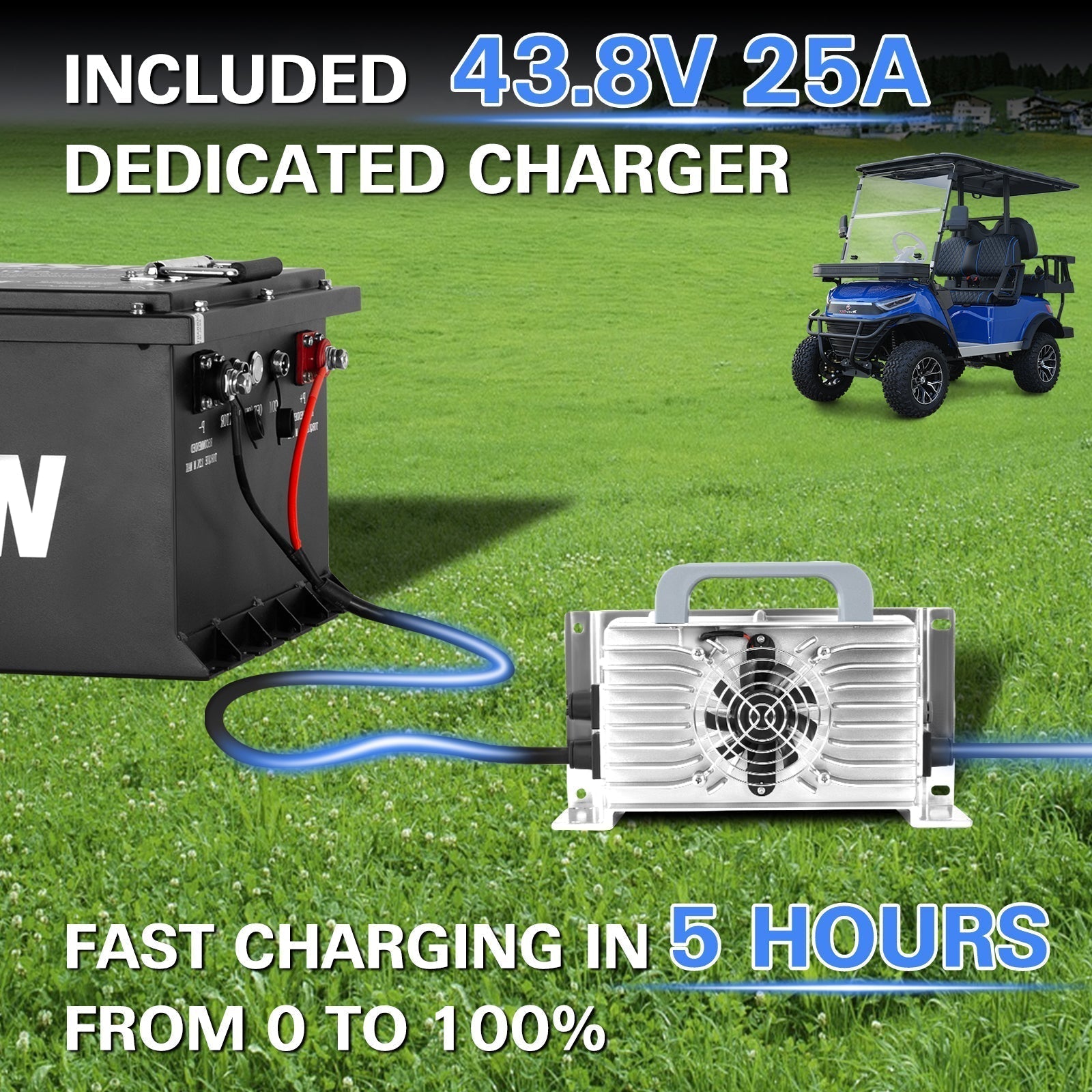 Included with the battery is a 43.8V 25A charger, ensuring rapid recharging to reduce downtime and keep your golf cart ready when you need it.