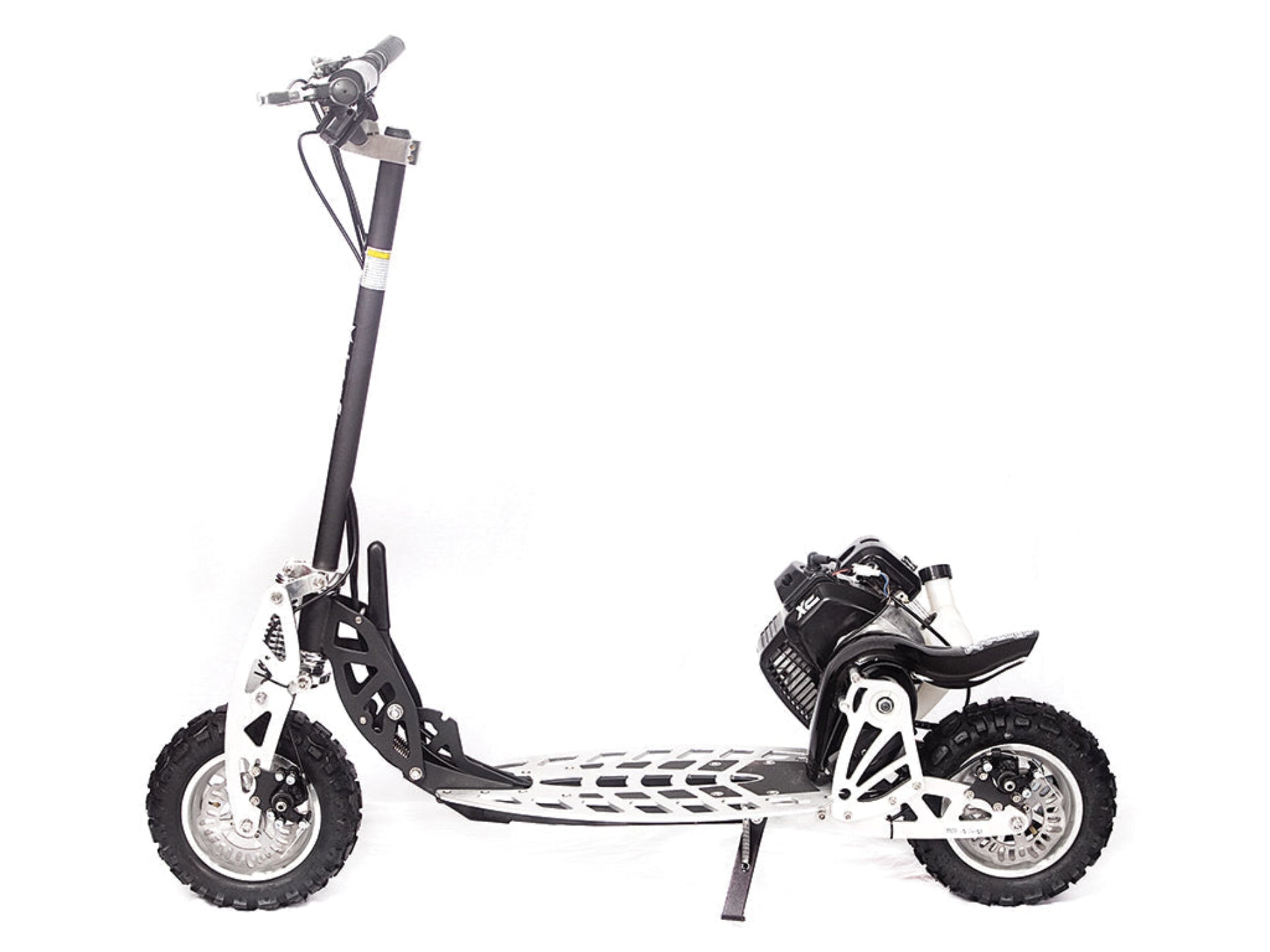 The features of this fast gas scooter include an Aluminum Billet deck and 11" KNOBBY air filled tires, (this is the ONLY scooter of this type available with oversize Knobby Tires) and this tough gas scooter also comes with a Patented Front Mono Shock Suspension System which will aid in a smooth ride and soft landings when jumping.